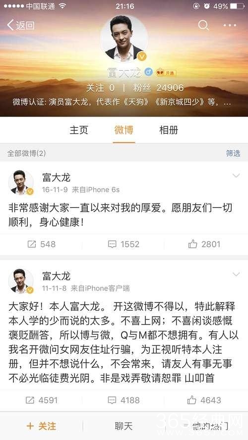 近日有网友“吐槽”国内某低调实力演员富大龙,看完以后感觉这原来才是娱乐圈老干部呀!人家喻恩泰靳东老干部还偶尔更新几则,富大龙6年就发了两条wb,一个屏就截全了。。哈哈。