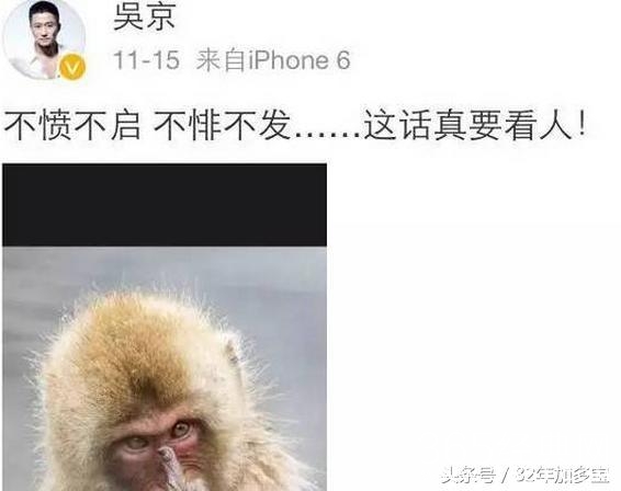 过了几天,吴京发了话中有话的微博,短短十四个字,加上一张竖中指的猴子相片,可以看出吴京当时有多么的气愤。