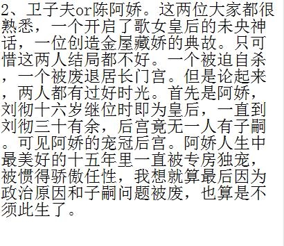 阿娇脾气不好,卫子夫算是完美了,不过也难逃一死。黄晓明的老婆结局都是蛮惨的。黄晓明这个人就是这样,不论政治决策还是性格为人,优点缺点都突出的无与伦比。好皇帝是不错。但是太无情了。为什么东方朔也是这德行。