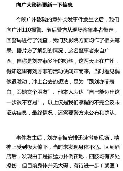 当时的视频妹妹也看了,情况是那位人翻越了隔离铁马突然冲上舞台,整个场面一片混乱,当这个人把刘亦菲扑倒的时候可以听到“砰”的一声,当时的刘亦菲一定摔得不轻,吓得不轻,还好最后保安把这个人抓了起来,没有让更危险的事情发生!