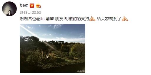 对于这件事,胡歌终于在昨晚微博发声了:“谢谢各位老师 前辈 朋友 胡椒们的支持 给大家鞠躬了”。