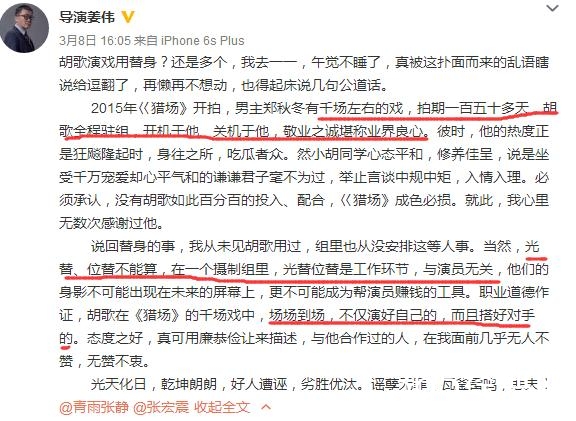 事情愈演愈烈,然而跟胡歌合作过的剧组及工作人员纷纷站出来支持胡歌,《猎场》导演更是发文称“胡歌拍摄期间全程跟组,业界良心,不仅百分之百投入,还搭好对手的戏,从无替身一说”。