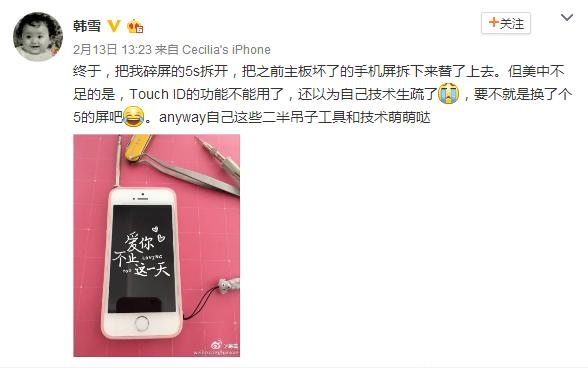 不得不说的5S控、换屏大神——韩雪。韩雪超爱的是5s,用到了现在,竟然自己还换了一次屏,勤俭朴素的娱乐圈科技大神有木有,请收下小编的膝盖。