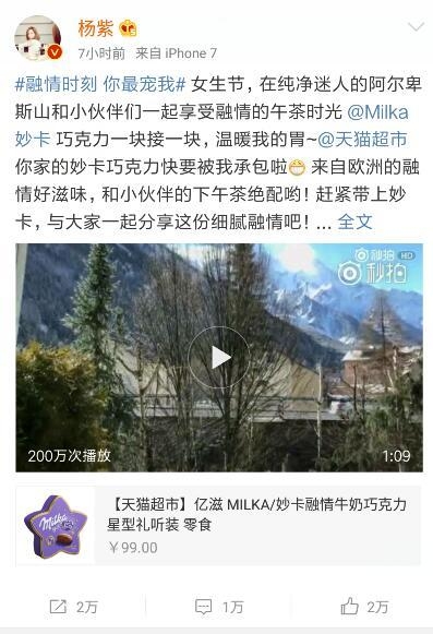 女生节,杨紫发微博身处在迷人的阿尔卑斯山,与小伙伴们一下享受午茶时光,而手上拿着的确是妙可巧克力,与众多粉丝分享。