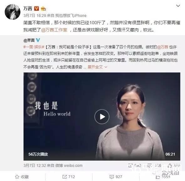 前几天写万茜的时候她说一百斤的自己并没有很显胖。