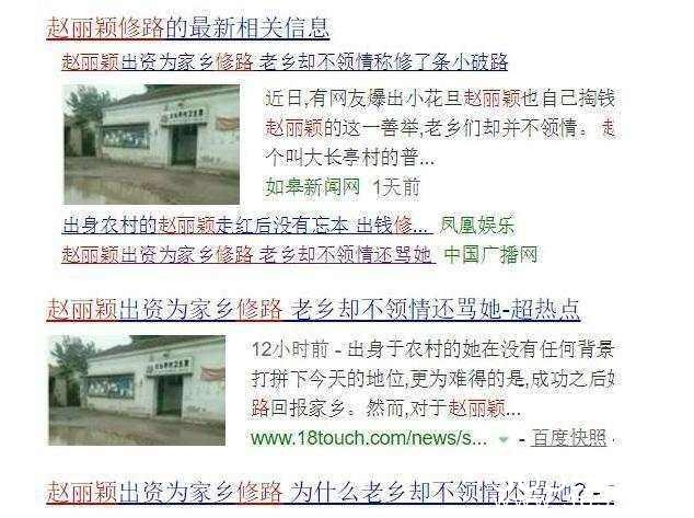 走红后的赵丽颖依然带有农村人的朴实真诚的一面,有了钱回馈家乡为村里修路,这本来对于全村的人来说是件很荣幸的事,在修完路后,赵丽颖万万没有想到竟然被黑被老乡抱怨是豆腐渣工程,在作秀。