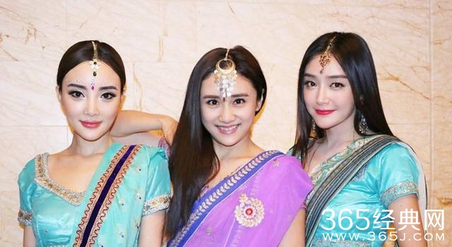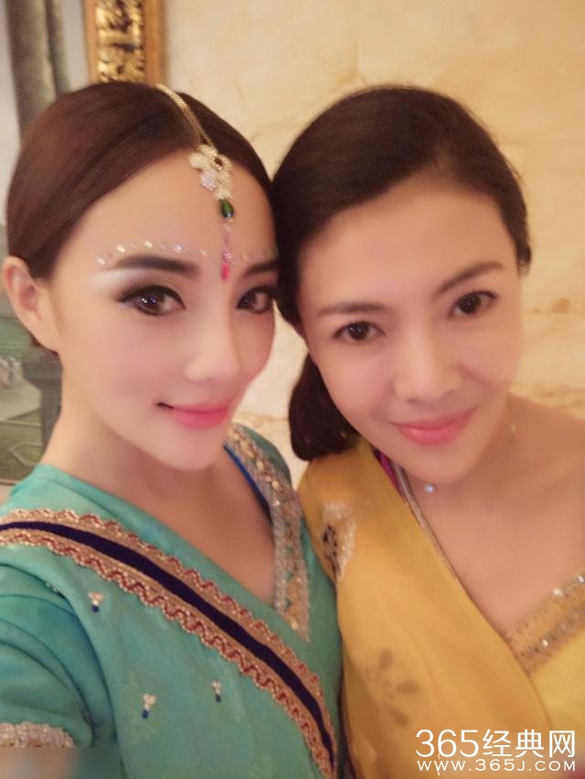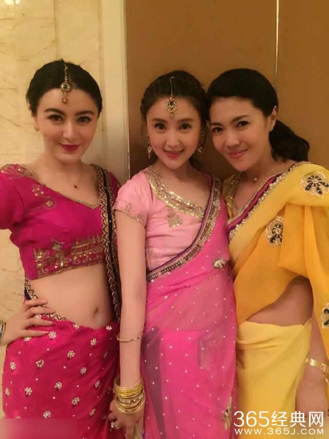 作为女主角的甘薇身穿粉色印度装与闺蜜合影给人感觉娇嫩,很减龄。