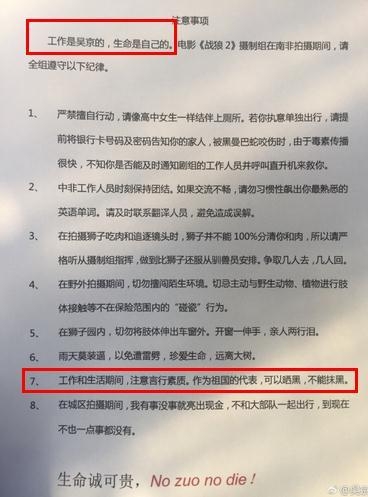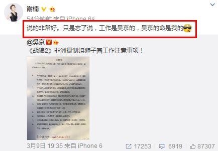 吴京将注意事项晒到网上后,有网友对第一句:工作是吴京的,生命是自己的,表示非常认同。不少网友留言称,吴京不愧是中国好老板。时隔一天后,也就是今天,吴京的老婆谢楠转发微博,并配文称:工作是吴京的,吴京的命是我的。这句话,同样也引来大量网友评论刷屏。