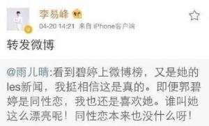 郭碧婷还点赞了说自己出柜的微博,王珞丹跟着点赞,李易峰转发。这帮明星…