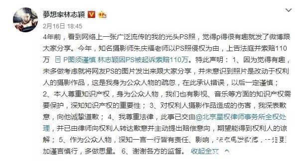 如今明星的版权意识好像都不太高,之前就有小志因为4年前PS事件被打脸赔了110万,还有张杰唱的歌也因为歌的版权问题差点背上黑锅,上个月因为一张PS照,林志颖不但在微博上公开做出道歉还被索赔110万的事,大家都知道吧。