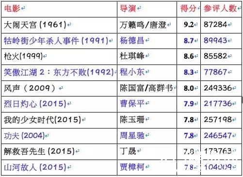 或参与人数众多而得分稍逊,如《烈日灼心》,217733人评价,豆瓣评分7.9。