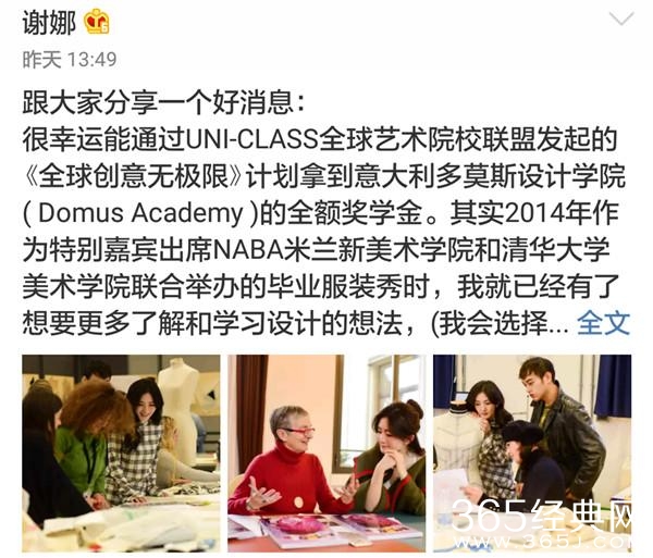 最近,谢娜更是在微博宣布,自己拿到了意大利多莫斯设计学院的全额奖学金,要去学设计了!