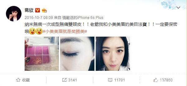 蒋欣就曾经在微博上晒出过自己贴双眼皮贴的过程。