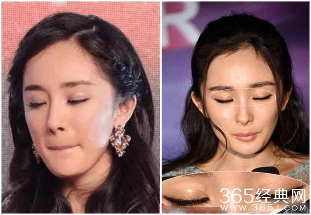 再仔细看,就能发现,这次杨幂出现颜值事故的罪魁祸首也许就是眼睑处亮闪闪的东西——双眼皮贴?