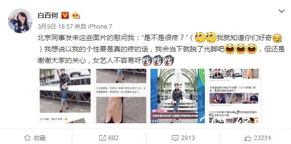 针对网友的调侃,白百何还特意发微博回应:不疼,要是疼的话早就脱下来光脚了。在这里,小不只能说,鞋合不合适,只有脚知道咯~!