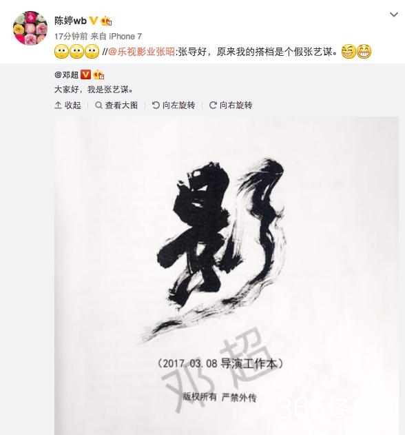 微博上发的图片,是他收到张艺谋新电影的导演工作本。
