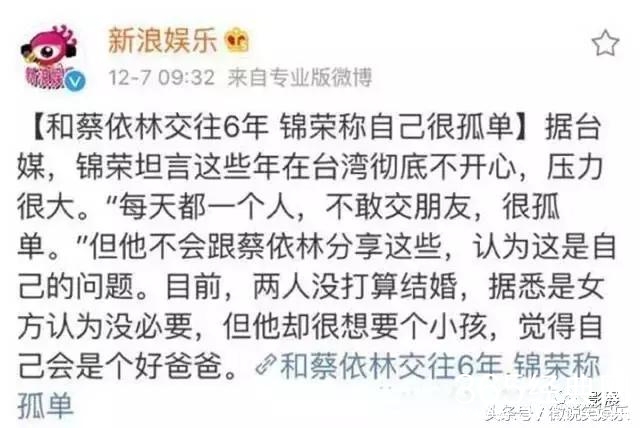 锦荣曾经在微博中说过,和蔡依林在一起6年,一直都不开心,每天一个人,不敢交朋友,很孤单!