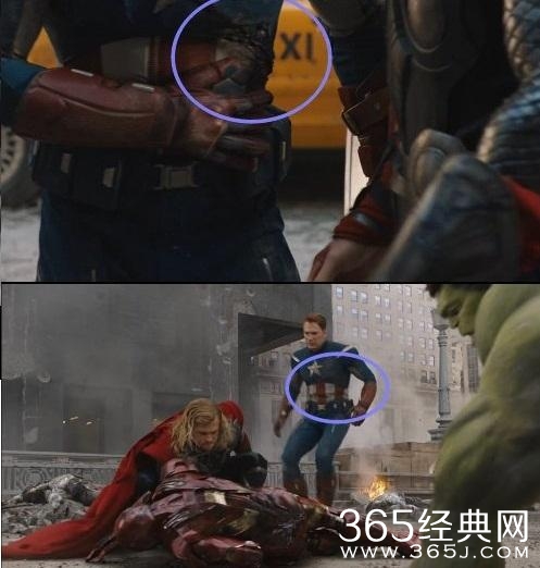 在对史蒂瑞的史诗般的战斗中,美国队长在他的左边用一个冲击螺栓,留下明显的伤害。然而,在钢铁侠从船扔出奇塔瑞人,美国队长的衣服不再受损。