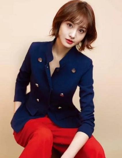 深蓝色西装外套搭配亮红色阔腿裤,这种撞色感丝毫让人感觉不出突兀,反而带有一种帅气的男友风,利落俏皮的小短发更是为整体造型加分不少。