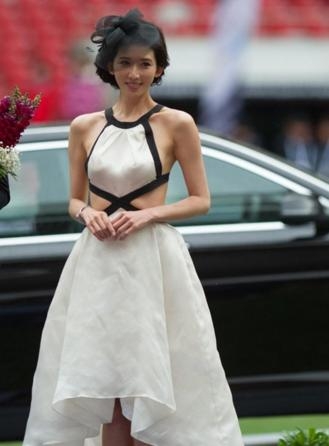 林志玲这一身白色镶黑边的性感小礼服,中式旗袍设计,腰线展露无疑,完美身材尽显而出,身姿十分诱人,还有黑色雾面小礼帽,颇有上海百乐门的风味。