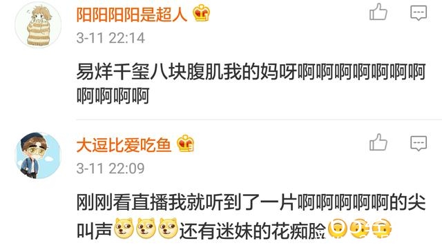 此次节目录制期间,易烊千玺和大张伟做游戏,一不小心露出了腹肌,立即被谢娜大赞:腹肌很厉害!像个小豹子!