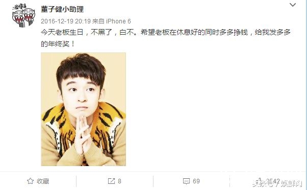 究竟这位董子健小助理到底是何许人也?从微博信息来看,目测应该男孩子,性格属小傲娇+财迷。这位神秘的董子健小助理所发的150条微博里面有148条在黑自己的老板,这究竟是怎样的情深的做到如此。不过黑老板技术真的一流,小编表示佩服。当代新助理要求:拍得了丑照,做的好表情包,写的了段子。