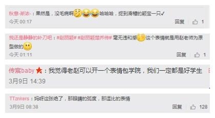 这不瞬间粉丝爆炸了,“果然是,没毛病啊,哈哈哈,捉到滑稽颖宝一只”“妈呀这张绝了,那眼睛的弧度,那逗比表情”“我觉得老赵可以开一个表情包学院,我们一定是好学生。”