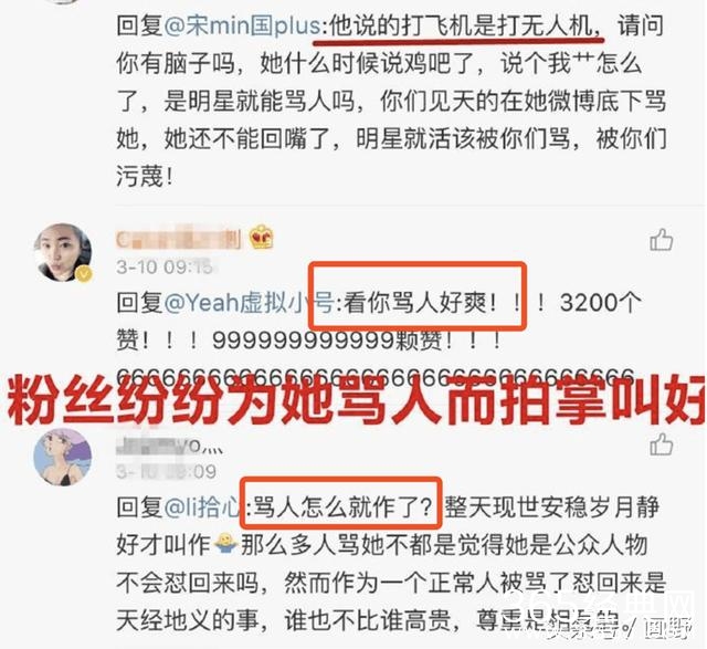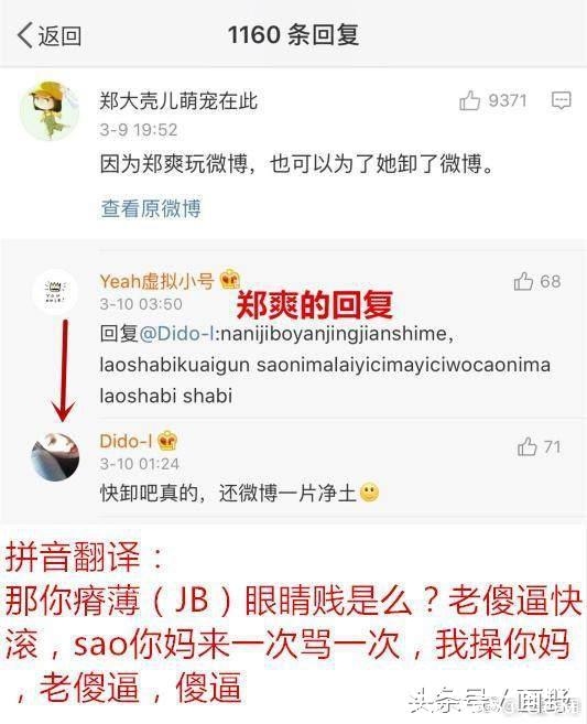 一名名为Diao-I的粉丝仅仅附和了别人一句“快卸载微博吧,还微博一片净土”就被郑爽惨骂贱SB,郑爽骂完之后粉丝们纷纷表示“骂得好”“看你骂人好爽,给你点赞!”: