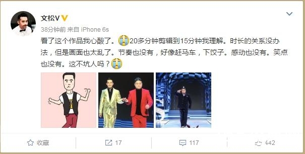 对于昨晚的表现,文松很是抱怨,3月13日清晨发文称:看了这个作品我心酸了。[泪]20多分钟剪辑到15分钟我理解。时长的关系没办法,但是画面也太乱了。