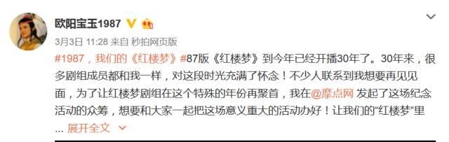 今年是电视剧87版《红楼梦》开播30周年,欧阳奋强提出“希望通过众筹的方式邀请所有红楼迷一起参与一场特殊的纪念活动,邀请身在国内外的剧组成员,回到大观园故地重游,并举办一场盛大的红楼主题音乐会”。