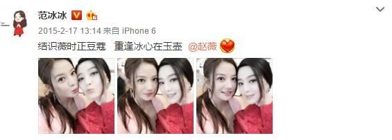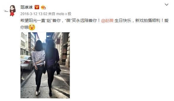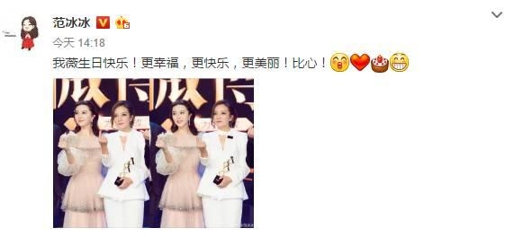 下午范冰冰也晒出了和赵薇在活动上的合照,大呼“我薇生日快乐!”