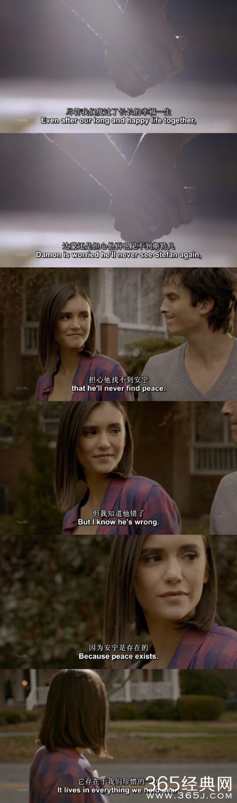 这部剧的结局就是:埃琳娜过完了一生后,在另一个世界终于与那些曾因她而死的挚亲重聚;达蒙在与埃琳娜携手走完人生后,来到家门前,与弟弟斯特凡紧紧相拥... ...最后一集是完美的,几乎所有曾出现过的人都出现了,每个人都找到了属于自己的归属。