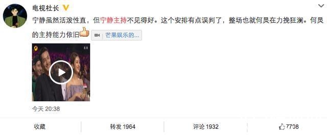 宁静初次客串掌管金鹰节颁奖晚会,原以为会给观众带来惊喜,假如发挥出在真人秀节目里的程度,那肯定相当精彩。但是,看到如今各种为难癌都犯了。真是慌张的不行了,台词完整照着念啊,背书一样,真得亏何炅教师干练。真是心疼何炅。