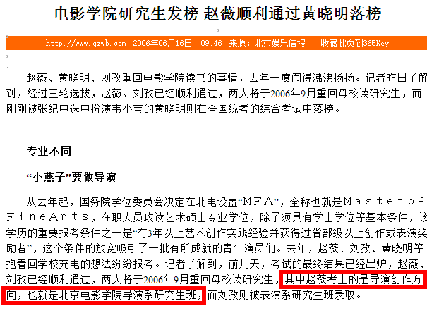 本娱记这就不乐意了,拜托,赵薇在2006年的时候就已经考上母校北京电影学院的研究生了。