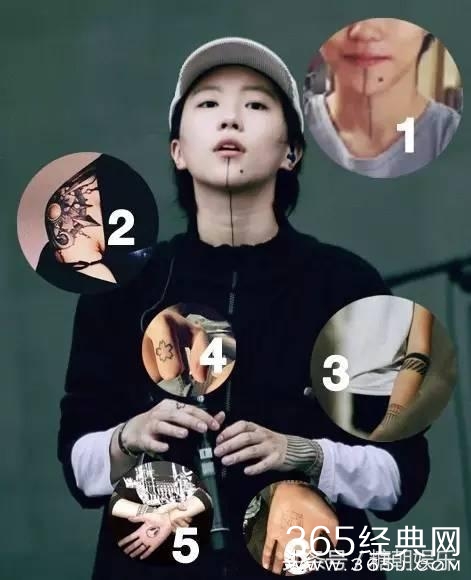 天后王菲和摇滚唱将窦唯的女儿,窦靖童身上的纹身数量比较多,但是最明显的还是下巴的一条直线,很多人不明白为什么窦靖童的这个纹身是什么鬼,因为看起来确实不好看,其实这处下巴的纹身是她给自己妹妹的礼物,她深深明白那些因为唇腭裂而自卑的孩子的痛(她妹妹就是不幸患者),为了让妹妹不会感到自己和别人不一样,她决定纹上这一条线。