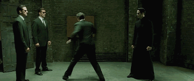 基努在《黑客帝国》系列中也有很多长镜头打斗,比如《黑客帝国2:重装上阵》中这段尼奥的四两拨千斤,也是4.8秒一镜到底。