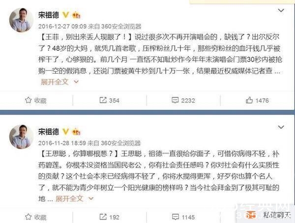 宋祖德骂人几乎不看对方背景,什么人都敢骂,比如一向低调很少露面的天后王菲,他都不放过,号称“国民老公”、娱乐圈的“纪检委”王思聪他也敢骂,甚至脾气火爆、有“钢炮”之称的冯小刚他也毫不畏惧。