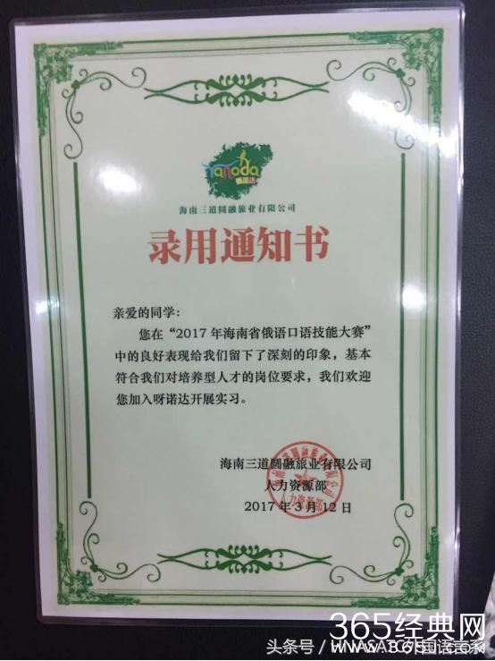 “呀诺达”公司为获奖选手颁发的实习录取通知书
