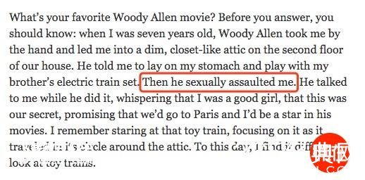 2014 年,28 岁的迪伦·法罗在《纽约时报》上发表了一封公开信,称伍迪·艾伦在她 7 岁时对她进行过性侵犯,引起好莱坞的轩然大波,伍迪·艾伦一直保持沉默。