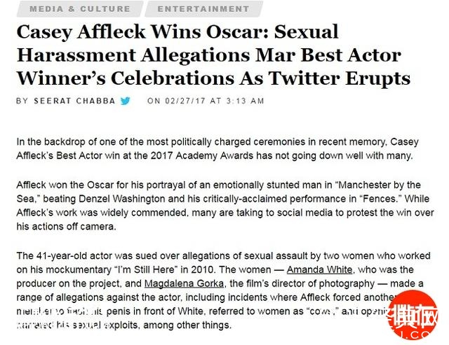 标题:受性骚扰指控的卡西·阿弗莱克赢了奥斯卡奖,推特炸了via ibtimes