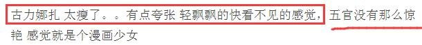 反观一直在网上被夸大美女的古力娜扎,网友则表示见过本人,太瘦了,轻飘飘的快看不见了,五官没有那么惊艳 感觉就是个漫画少女。