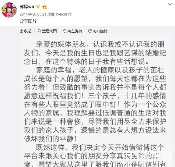 2014年,陈婷开了新浪微博,自我介绍言简意赅——张艺谋妻子 陈婷。在第一篇微博中,她也坦言开博的目的就是为了晒她与张艺谋的生活。