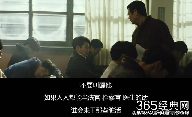 这样的差生,老师是打从心眼里看不起的,至少成东日客串的这位老师是这样想的。男主角在课堂睡觉,他对想要叫醒男主的学生说:“不要叫醒他,如果人人都能当检察官、医生,谁会来干那些脏活?”看,在学校里就已经有人帮你划分好三六九等了,残酷吗?