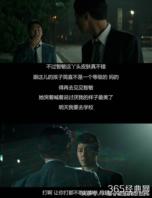 这里也牵出了另一条线,郑雨盛演的韩部长与野狗帮老大金应秀勾结,这位老大除了爱钱还有一个爱好,看自己的狗如何分食活人,呕……