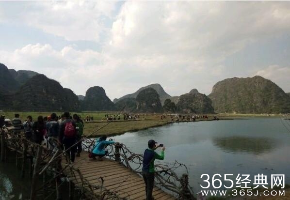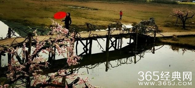 而现实中的此情此景确是这样的。桃花早已衰败,浮桥也显得有点孤零。加上电视剧的热播,景区引来了不少游客留恋拍照。逐渐打破了以往的唯美。