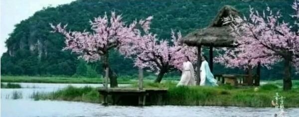 我们先来看看,这是电视剧里的截图,色调、风景都如此美轮美奂。桃花轻抚,绿水涟漪。