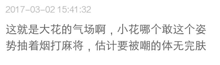 还有网友评论道:这就是大花的气场啊,小花哪个敢这个姿势抽烟打麻将。