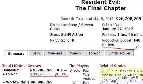 《生化危机6》亦是如此。该片预算4000万美元,北美票房2671万美元。海外票房2.8亿美元,占全球票房比91.3%。