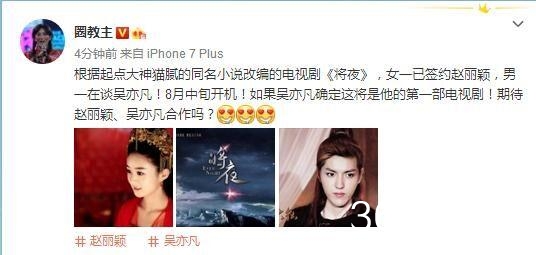 8月中旬开机!如果吴亦凡确定这将是他的第一部电视剧!也是赵丽颖与吴亦凡的首度合作。