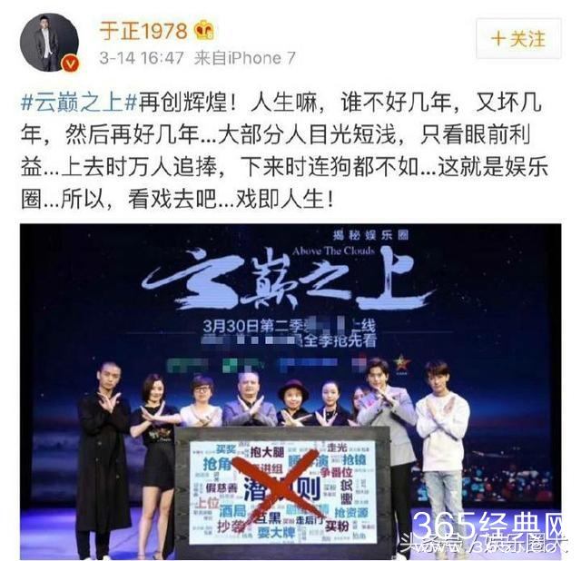 相比袁姗姗的大度回应于正作为一个男人却显得小肚鸡肠,于正发微博暗讽袁姗姗目光短浅,只顾眼前利益,到时候摔下来狗都不如。